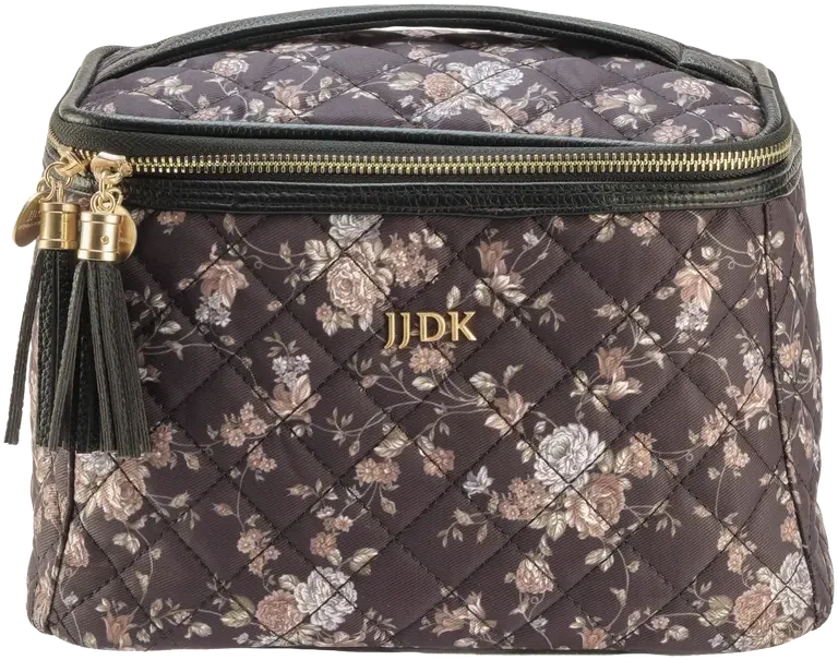 Svart, blomstrete kosmetikkveske i stor størrelse med toveis glidelås med dusker. Med bærehåndtak på toppen og innvendige lommer for sminkekoster samt en glidelåslomme.